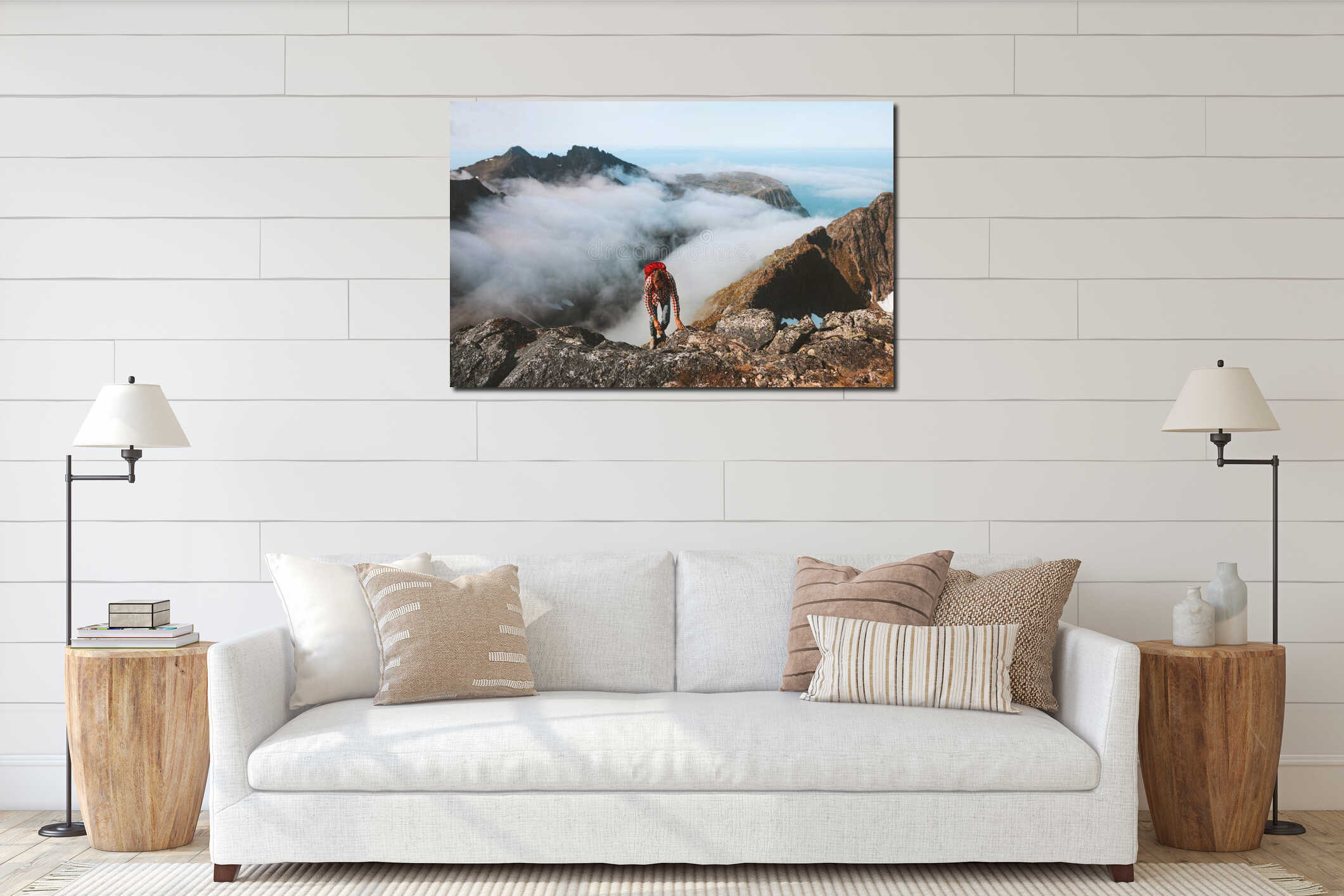 Hiker man climbing on mountain top above clouds travel hiking with backpack Canvas Print