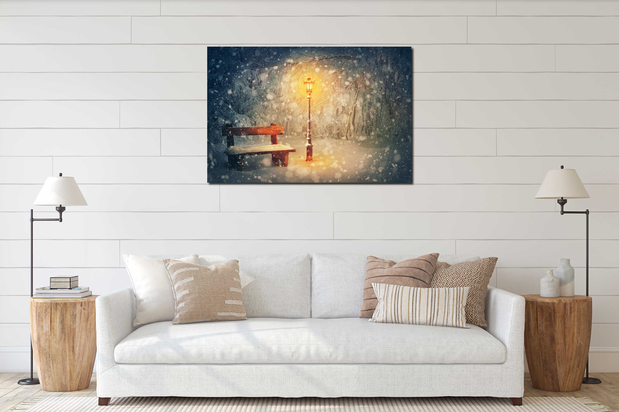 Wintertime night scene in the park. Shining street lamp near a wooden bench covered with snow. Wonderful winter holidays seasonal Canvas Print