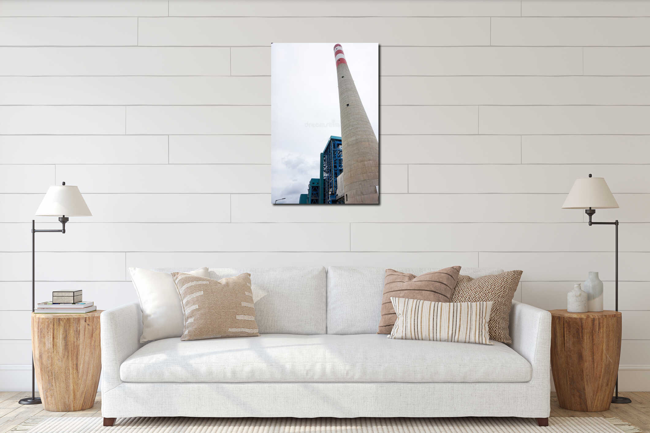 Industrial architecture and atmospheric perspective of a power plant chimney against a cloudy sky Canvas Print