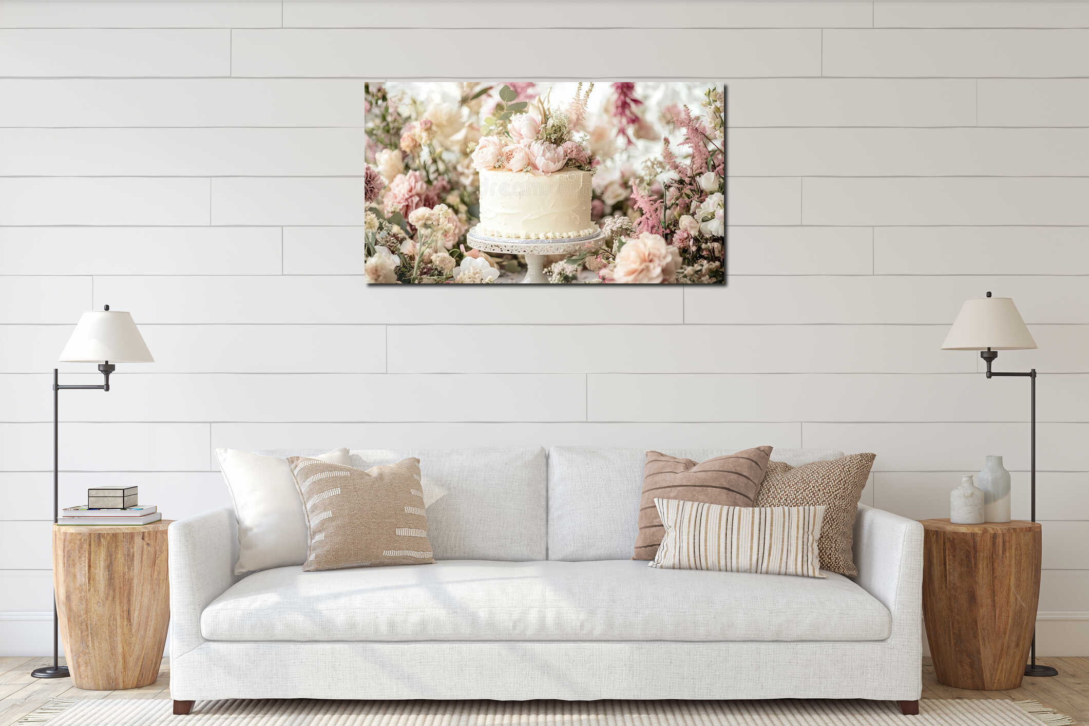 Birthday cake surrounded by elegant floral arrangements in soft tones . Canvas Print
