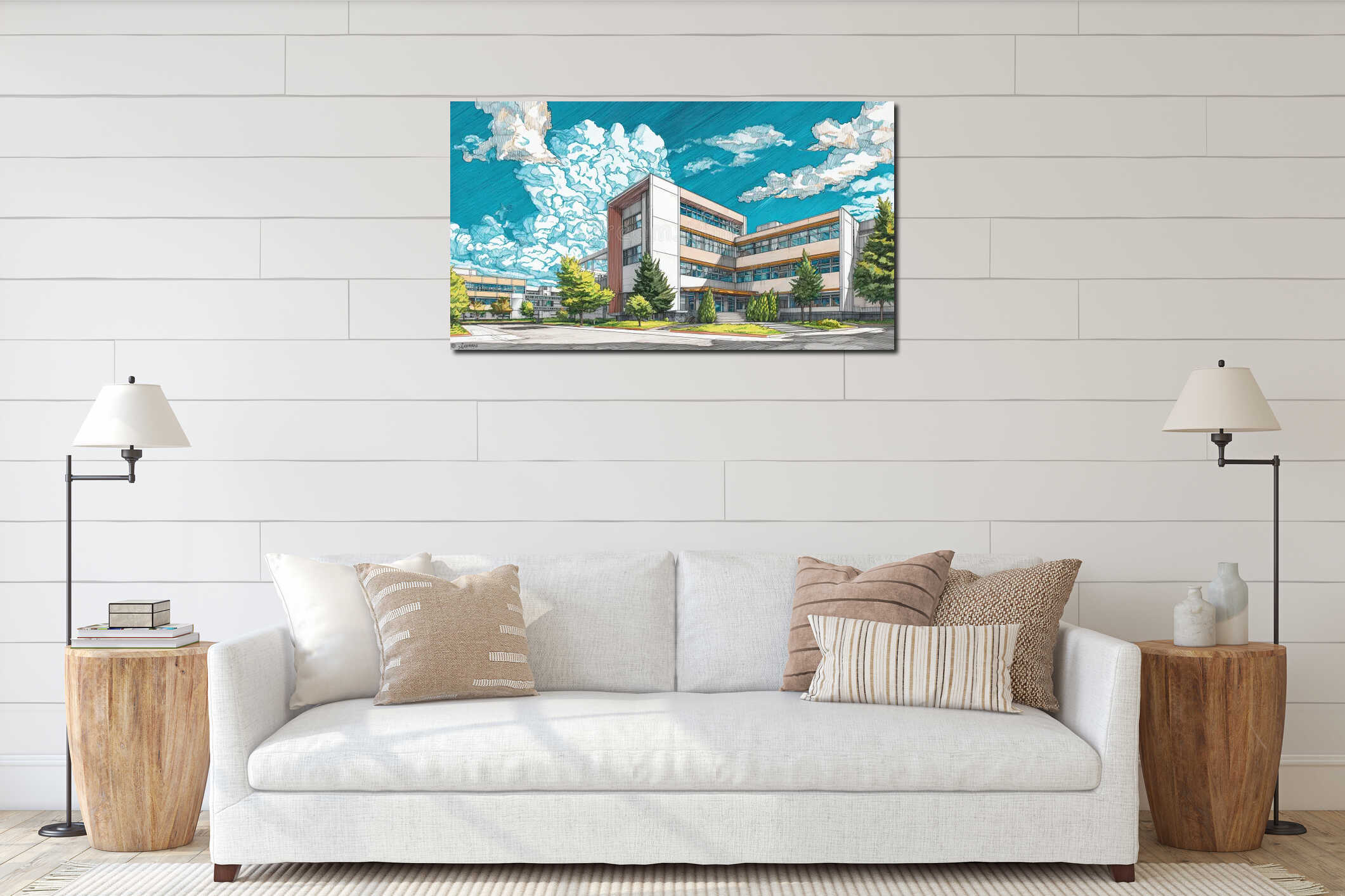 Modern school building drawn in marker style, artistic architectural illustration showing clean lines, glass windows, and bright Canvas Print